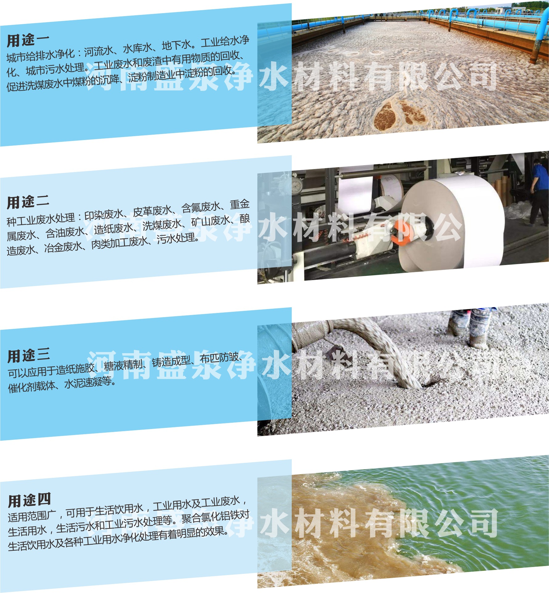 2、净化工业用水、工业废水、矿山、油田回注水、净化造水、治金、洗煤、皮革及各种化工污水处理等。