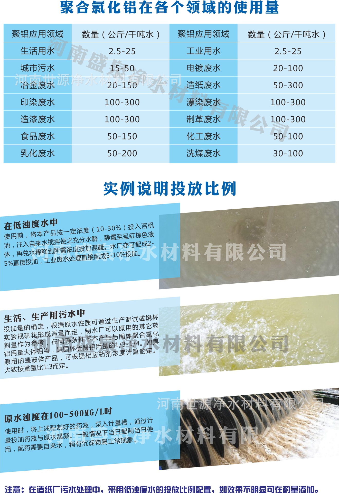 2、用量可根据原水的不同浑浊度,测定投药量,一般原水浊度在100-500mg/L时,每千吨投加量为10-20kg